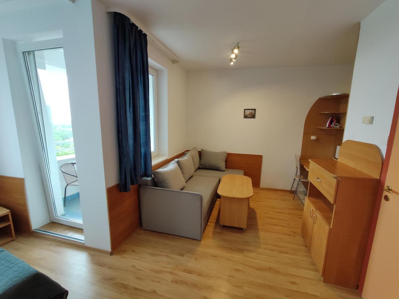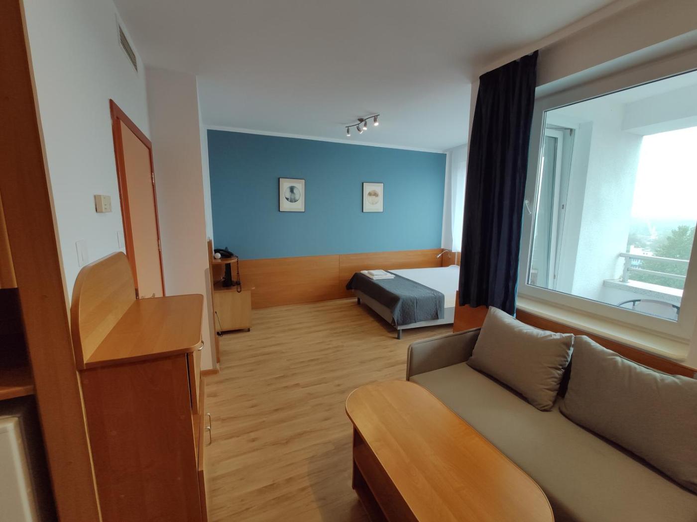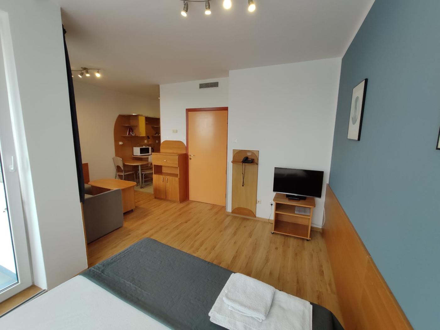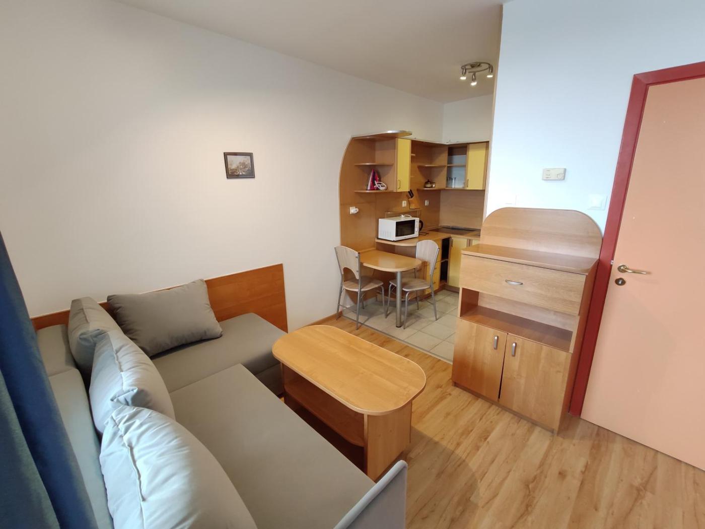 Apartament typu studio z widokiem na morze. This apartment comes with 1 living room, 1 separate bedroom and 1 bathroom with a walk-in shower and free toiletries. Guests can make meals in the kitchen that features a stovetop, a refrigerator, kitchenware and a microwave. The air-conditioned apartment features a flat-screen TV, soundproof walls, a dining area, a wardrobe as well as sea views. The unit has 2 beds. Apartament - 4 osobowy. Powierzchnia pokoju ok.: 46 mkw.