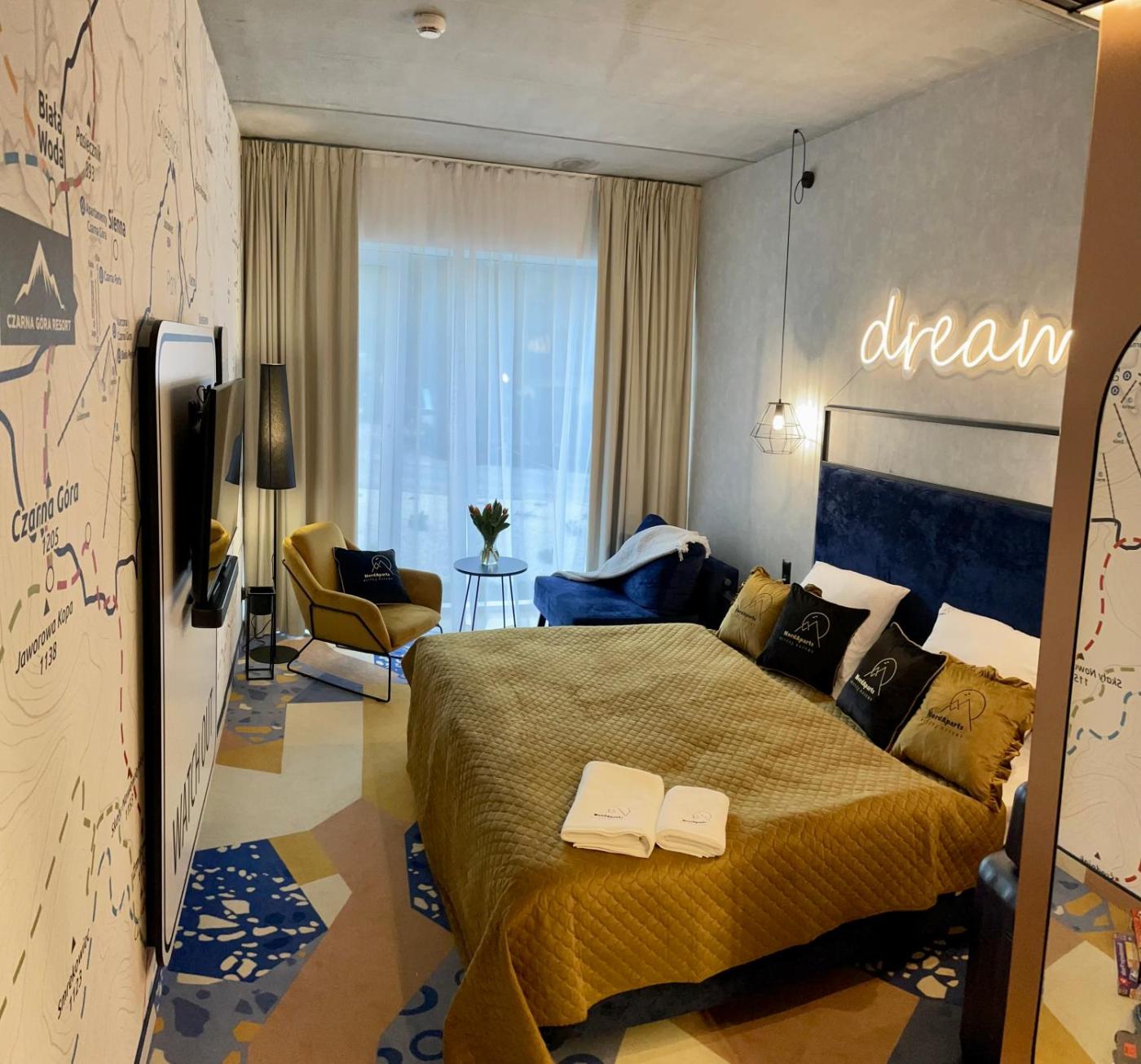 Studio typu Deluxe. The studio features air conditioning, a tea and coffee maker, as well as a private bathroom boasting a walk-in shower and a hairdryer. The studio has carpeted floors, a seating area with a flat-screen TV with cable channels, a wardrobe, a safe deposit box, as well as a sofa. The unit has 2 beds. Powierzchnia pokoju ok.: 23 mkw.