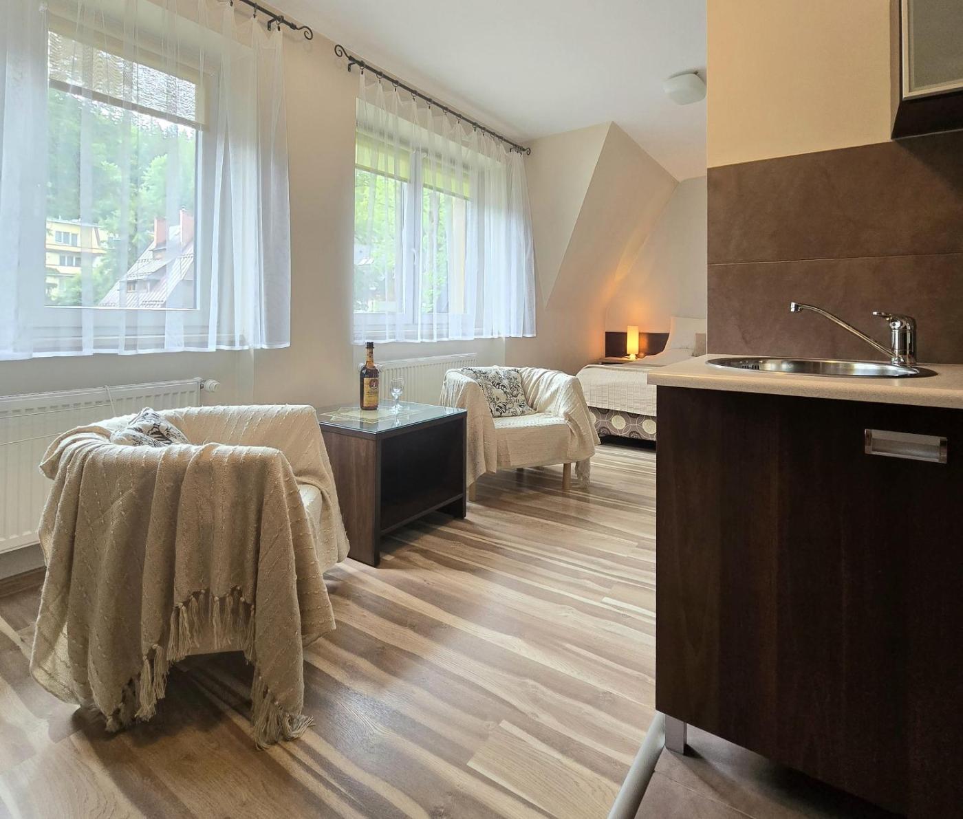 Studio z rozkładaną sofą. W salonie znajduje się rozkładana sofa, aneks kuchenny z lodówką oraz duży telewizor z płaskim ekranem. Drugi pokój wyposażony jest w fotele. Studio - 2 osobowy. Powierzchnia pokoju ok.: 25 mkw.